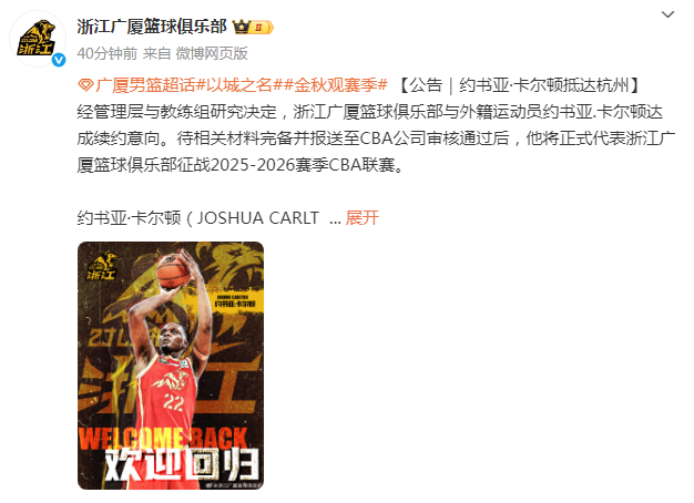 广厦官方公告明确表示:"经管理层与教练组综合评估,浙江广厦篮球俱乐部与外援卡尔顿达成续约意向。待相关材料通过CBA公司审核后,他将正式代表球队征战2025-2026赛季CBA联赛。"这份公告同时透露,卡尔顿已于11月4日晚携家人抵达杭州,目前正随队进行新赛季备战。