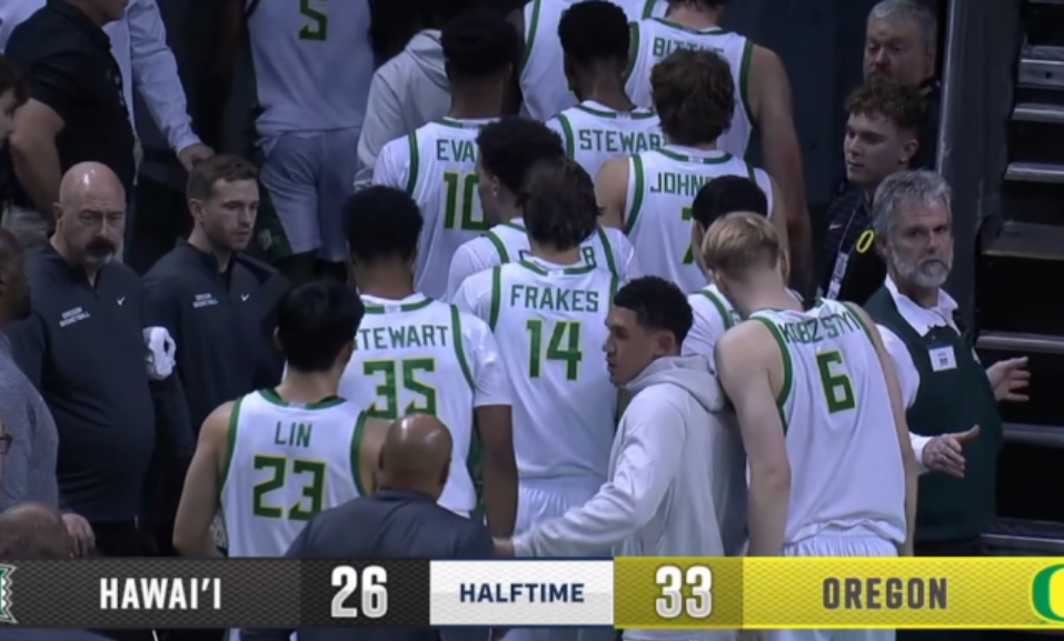 上半场,俄勒冈大学凭借微弱的领先优势结束比赛。全队27投12中,其中三分9投2中,罚球10投7中。全队只有辛普金斯7投4中得到11分,成为唯一得分上双的球员。而夏威夷大学则34投10中,外线三分17投2中疯狂打铁,罚球9投4中,全队没有球员得分上双。