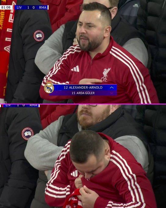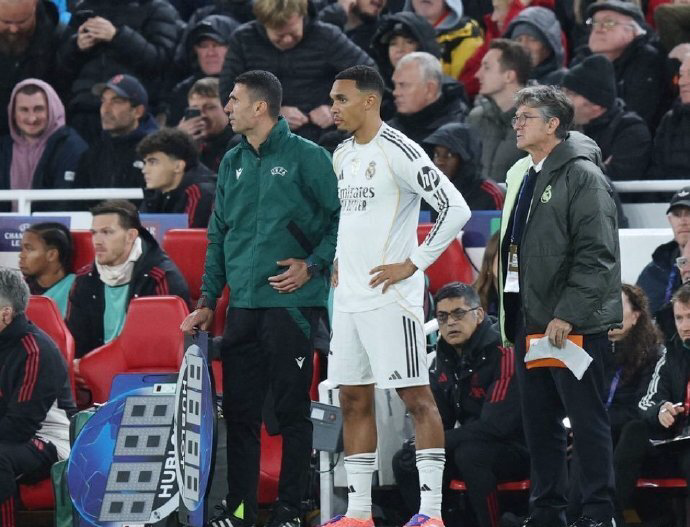 本场比赛中,阿诺德并未获得首发机会。尽管他已经伤愈复出,但皇马主帅阿隆索宁愿选择让巴尔韦德客串右后卫,也不敢冒险让阿诺德先发登场。当赛前广播念到阿诺德的名字时,安菲尔德球场瞬间爆发出震耳欲聋的嘘声,6万名利物浦球迷用这种方式表达着对这位昔日青训骄子的不满。
