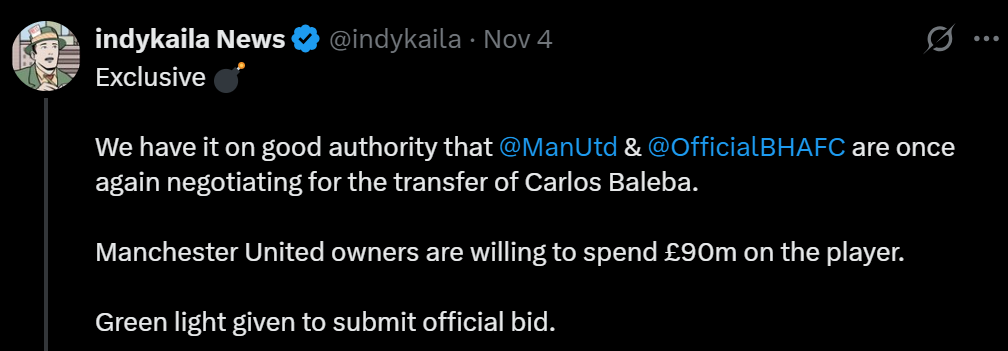 布朗指出,在上个月曼联4-2战胜布莱顿的比赛中,巴莱巴未能给潜在的新东家留下深刻印象,反而引起了人们的担忧。曼联赛季中途引进一名状态不佳的球员,显然没有意义。而且,吉姆·拉特克里夫爵士也不会在冬窗花费9000万英镑巨资进行引援。