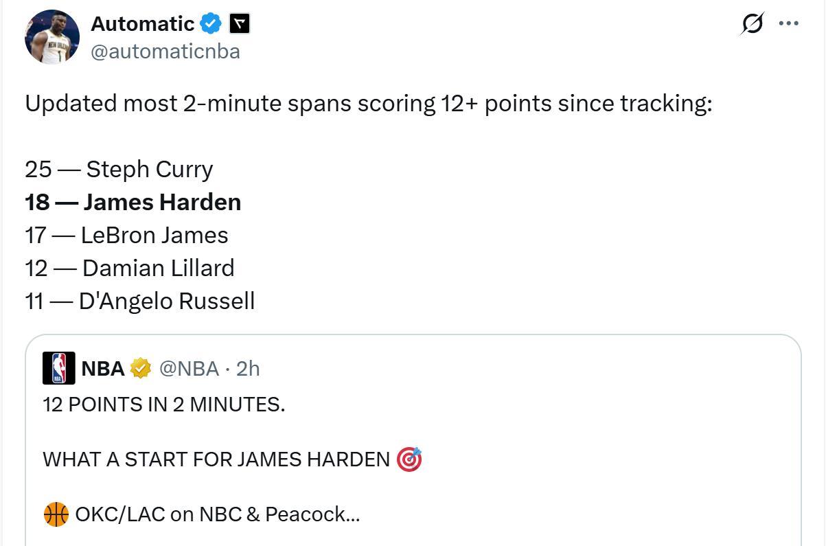 哈登此役首节2分钟内狂砍12分,据统计,自有相关数据统计以来(1996-97赛季),哈登共18次达成此成就,排名历史第二,仅次于某位未公开球员,勒布朗·詹姆斯与利拉德分列第三、第四。尽管哈登全场25分6篮板6助攻的表现堪称全能,但无奈球队末节崩盘,最终三节打卡下班。