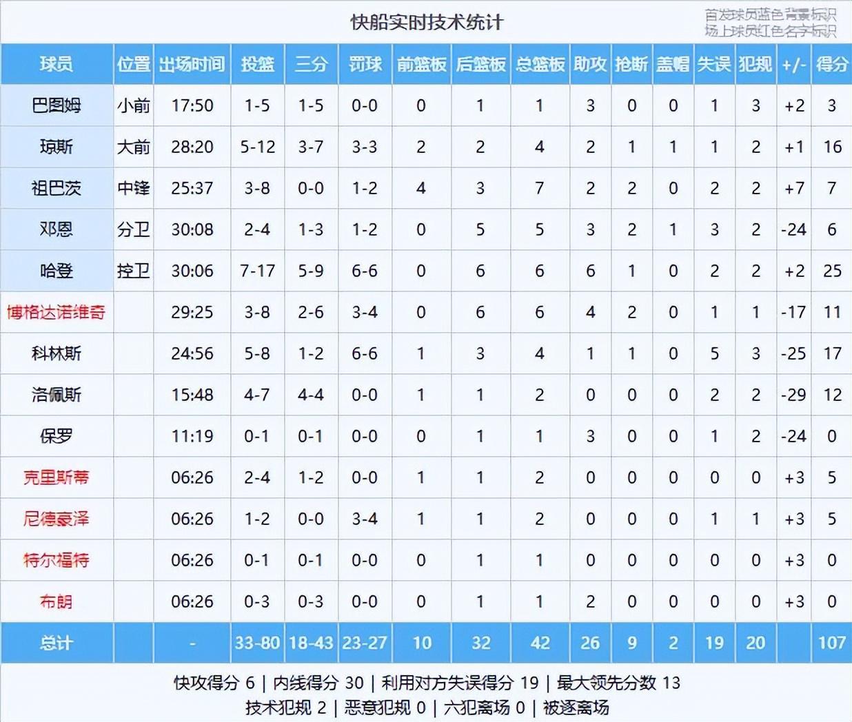 快船数据(主队):哈登25分6板6助、科林斯17分4板1助、琼斯16分4板2助、洛佩斯12分2板、博格达诺维奇11分6板4助2断、祖巴茨7分7板2助2断、邓恩6分5板3助2断、尼德豪泽5分2板、克里斯蒂5分2板、巴图姆3分1板3助、保罗1板3助、布朗1板2助、特尔福特1板