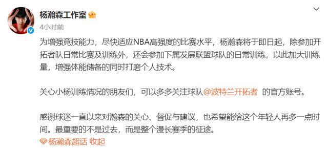 随后,杨瀚森工作室更新社媒发声:“为增强竞技能力,尽快适应NBA高强度的比赛水平,杨瀚森将于即日起,除参加开拓者队日常比赛及训练外,还会参加下属发展联盟球队的日常训练,以此加大训练量,增强体能储备的同时打磨个人技术。”工作室还表示:“关心小杨训练情况的朋友们,可以多多关注球队的官方账号。感谢球迷一直以来对瀚森的关心、督促与建议,也希望能给这个年轻人再多一点时间。最重要的不是过去,而是整个漫长赛季的征途。”
