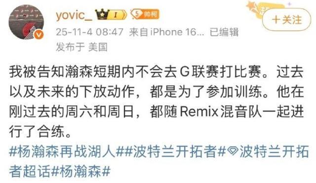 11月3日,@波兰特开拓者 官宣:我们已经从发展联盟混音队召回了中锋杨瀚森。