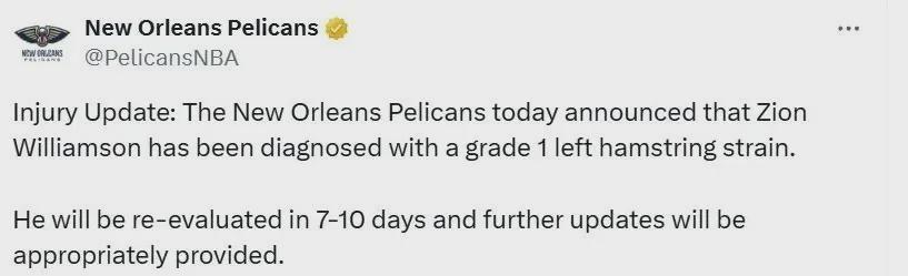 鹈鹕队官方宣布,锡安在比赛中不幸受伤,确诊为左腿筋一级拉伤,预计将在7-10天后接受复查,以确定伤势的恢复情况。这一消息对于鹈鹕队来说无疑是一个沉重的打击,毕竟锡安作为球队的绝对核心,他的缺席将对球队的战绩产生重大影响。
