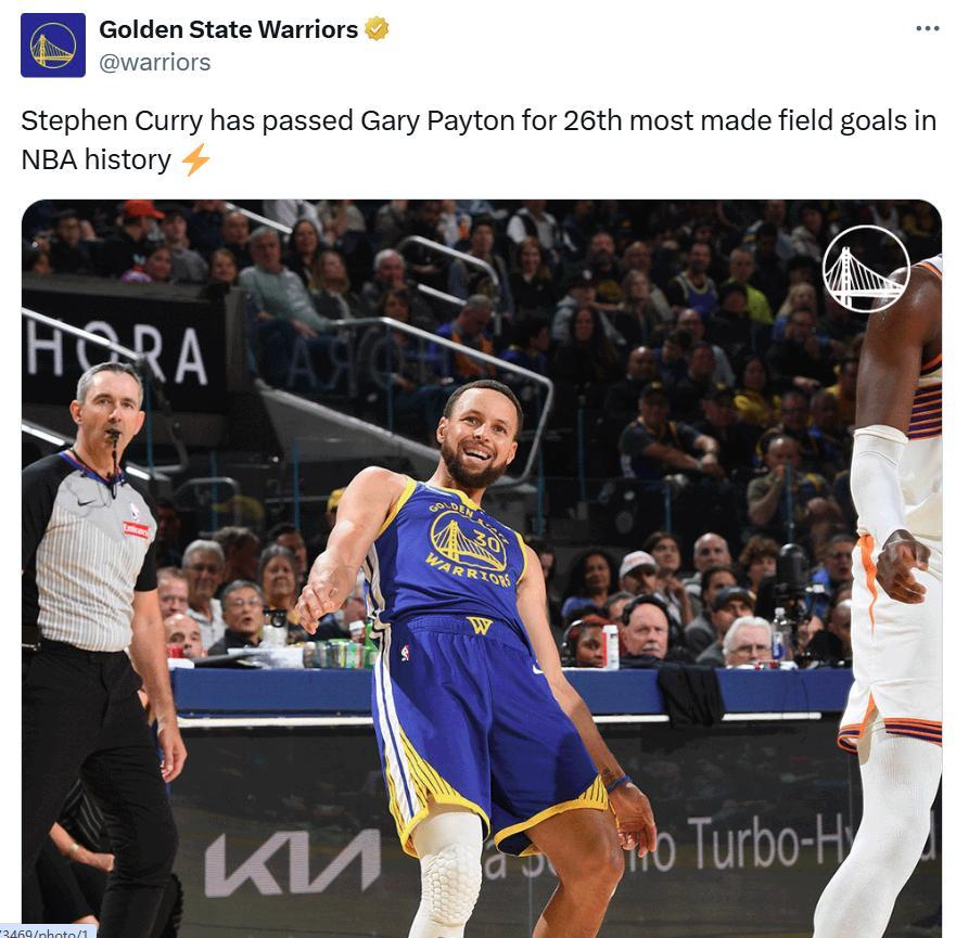全场库里三分球12中5拿下28分4板3助1断1帽全能表现,凭借这样的表现库里生涯命中数提升至8717球,成功超越加里-佩顿(8708)独占历史第26位。