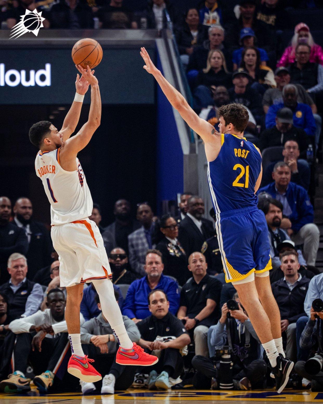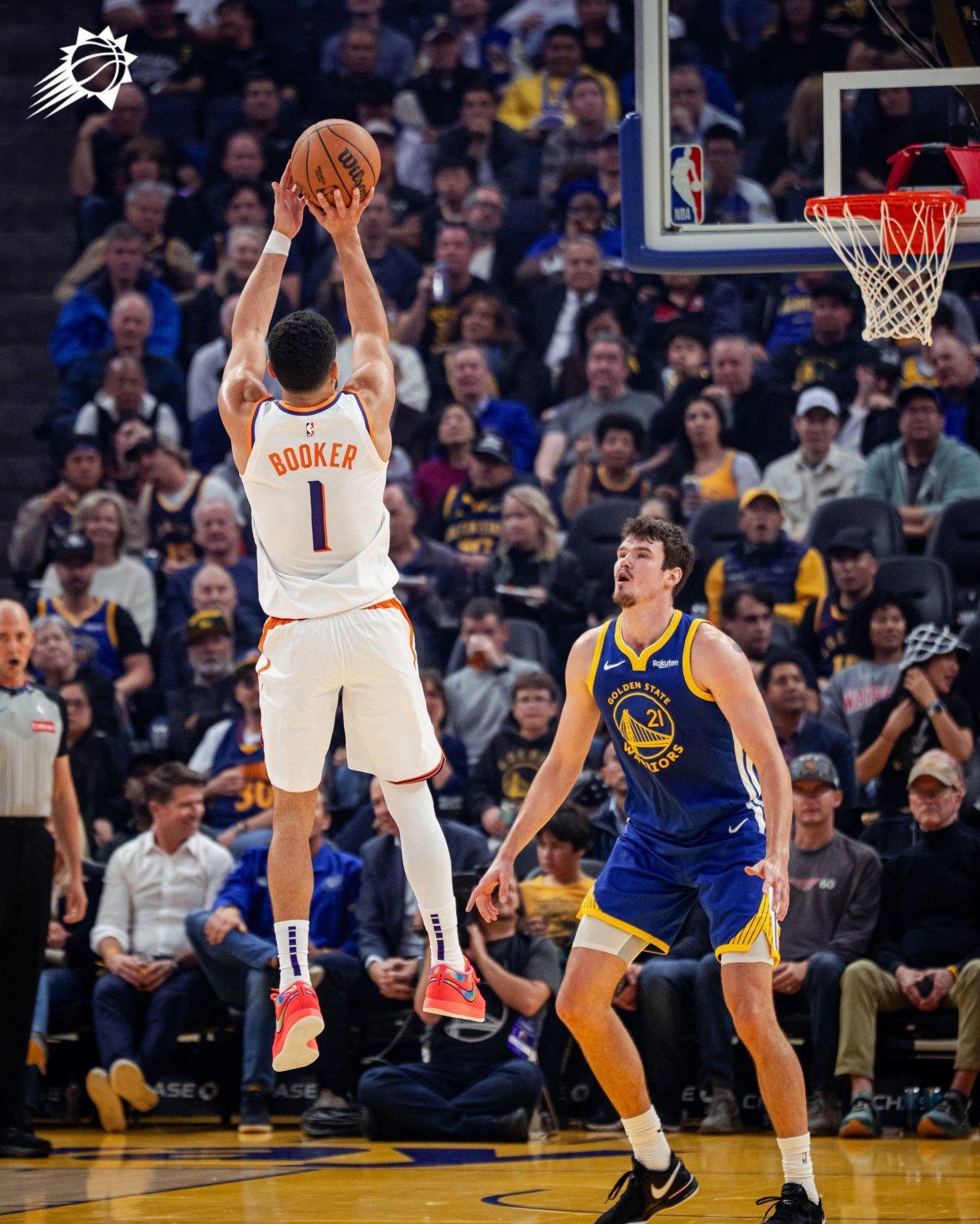 太阳球星德文·布克拼尽全力,登场39分钟,24投13中(三分5中1,罚球11中11),怒砍38分3篮板4助攻1抢断。布克以54%的命中率轰下全场最高分,罚球命中率100%,且是此役走上罚球线次数最多的球员。布克上半场砍下17分,第三节再得17分,末节仍在努力追分。在他的率领下,太阳一度看到逆转希望,但穆迪、库里的稳健发挥让布克全场的努力功亏一篑。
