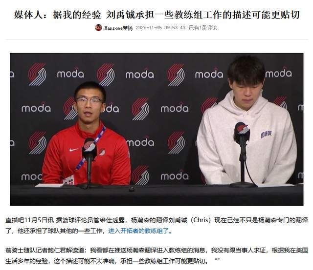 近日,一则关于中国篮球新星杨瀚森的新闻引发广泛关注——其专职翻译刘禹铖(英文名Chris)已不再局限于翻译工作,而是正式进入波特兰开拓者队教练组,承担更多专业职责。这一职业转型被媒体称为"最励志的翻译逆袭"。