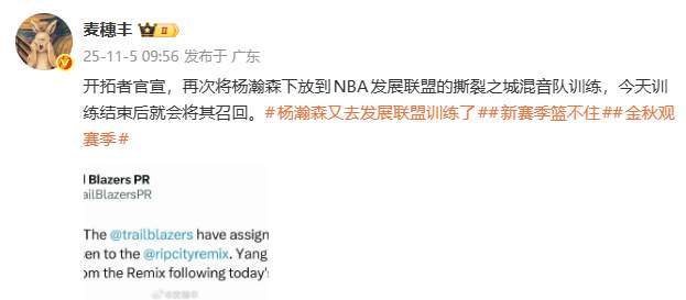 对比刘禹铖的职业突破,杨瀚森的NBA发展轨迹则引发担忧。11月5日,开拓者再次将其下放至发展联盟进行特训,当日训练结束后召回。这种"下放-召回"的循环模式,暴露出新秀球员在身体对抗和战术理解方面的不足。球队管理层明确表示:下放旨在强化体能训练,召回则是为了学习战术体系。