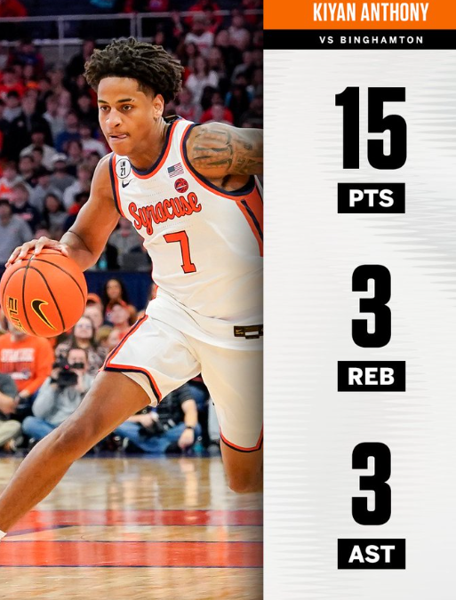 在皮特森、迪班萨等一众热门候选之外,有一位四星高中生同样吸引了大量关注,他就是雪城大学的一年级得分后卫——基扬-安东尼。没错,他就是甜瓜卡梅隆-安东尼的大儿子。