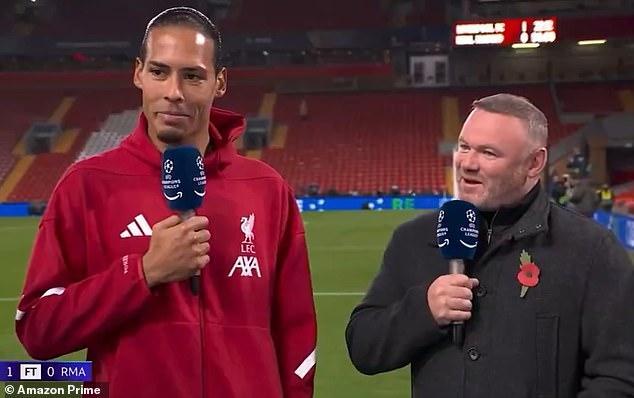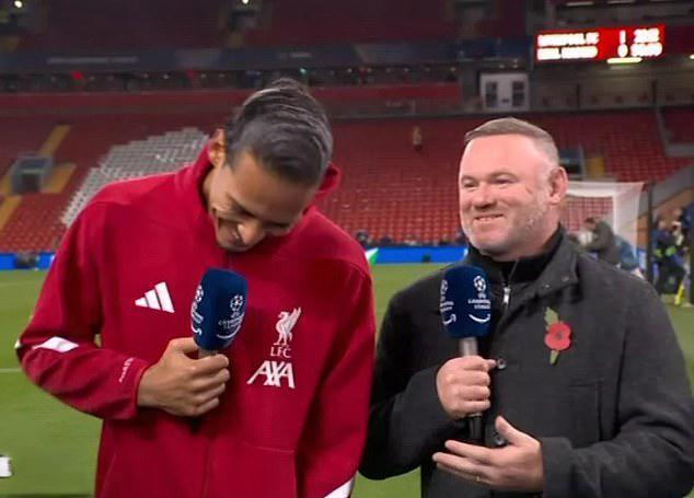 周二晚安菲尔德球场,利物浦1-0力克皇家马德里的焦点战后,命运般的安排让两位当事人同台亮相。当主持人盖比·洛根问及范戴克是否在暗示某位评论员时,镜头捕捉到鲁尼意味深长的微笑。荷兰人从容回应:"重要的是认清形势,用行动摆脱困境。我们拥有25名球员,年轻球员需要时间成长,老将则要以身作则。"