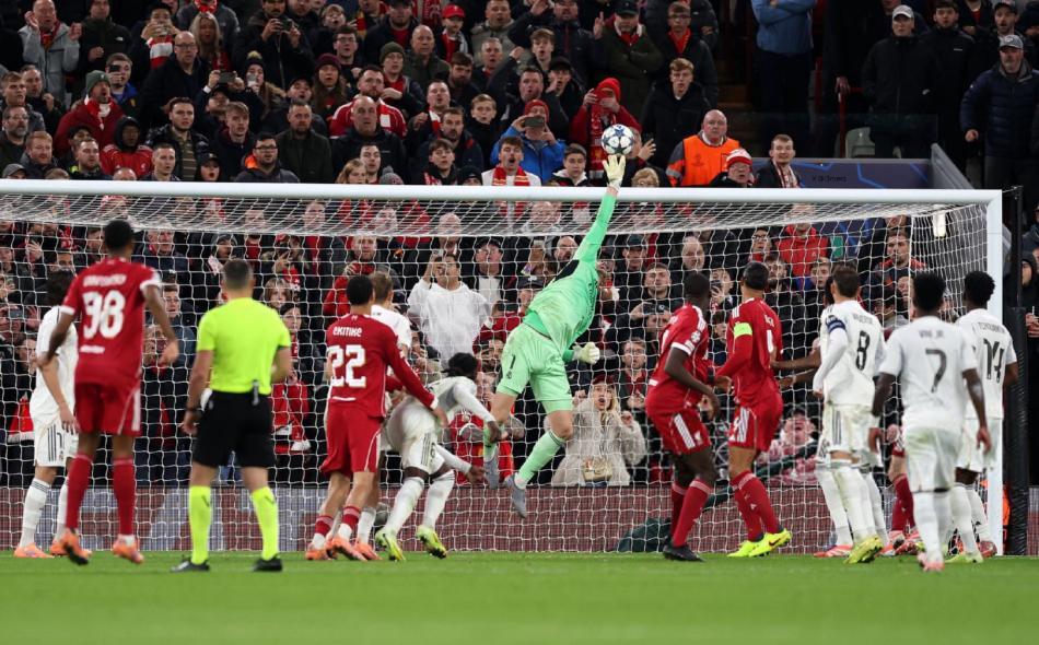 第23分钟,维尼修斯直接放倒了前插的布拉德利,吃到黄牌,送给了利物浦一个位置极佳的定位球。索博斯洛伊将球送入禁区,范戴克头球偏出。几分钟后,利物浦卷土重来,维尔茨横传中路,索博斯洛伊在点球点附近的劲射,被出击的库尔图瓦神奇扑出,皇马逃过一劫。