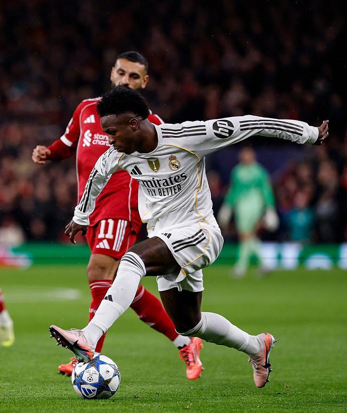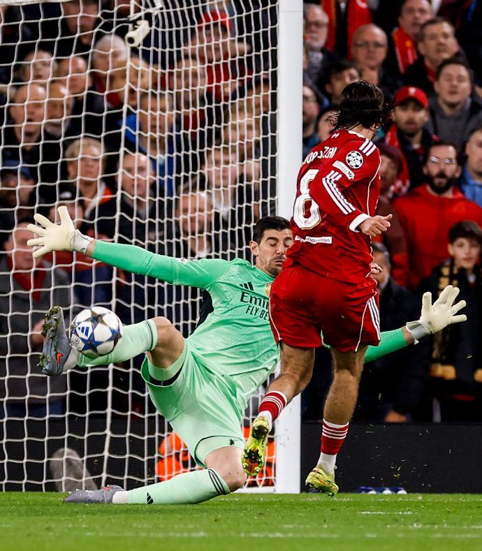 易边再战,库尔图瓦继续上演神奇表现:利物浦左侧角球开出,范迪克近在咫尺的头球攻门被其神勇扑出,荷兰中卫只能苦笑摇头。但红军的持续攻势终于在第61分钟收到回报——索博斯洛伊开出定位球,麦卡利斯特头球破门打破僵局。第75分钟,维尼修斯左路倒三角传中,姆巴佩跟进射门偏出;第82分钟,利物浦旧将阿诺德替补登场,但未能创造威胁,反而目睹主队在最后阶段形成多次有威胁进攻,皇马全靠库尔图瓦的高接低挡才避免比分扩大。