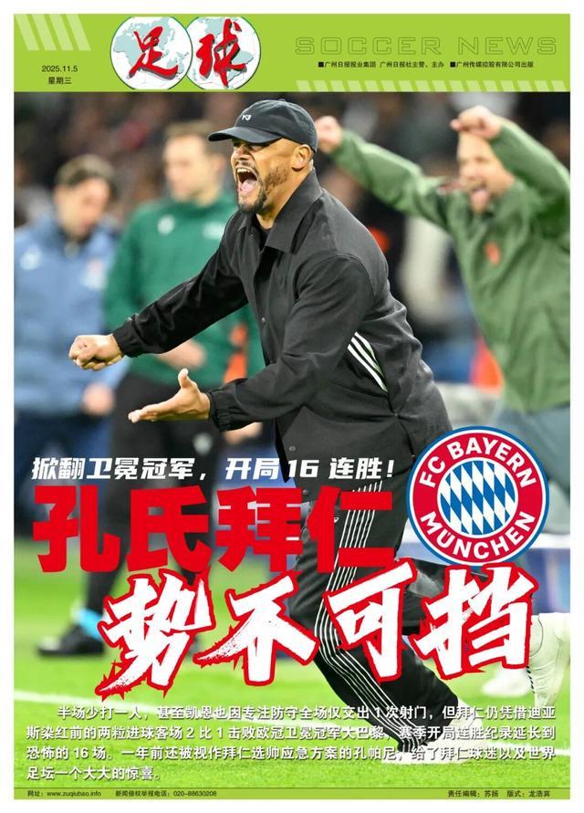 撰稿/寒冰 半场少打一人,凯恩因专注防守全场仅1次射门,但拜仁仍凭借迪亚斯染红前的两粒进球,客场2比1击败欧冠卫冕冠军巴黎圣日耳曼,赛季开局连胜纪录延长至16场。一年多前还被视作拜仁选帅“应急方案”的孔帕尼,如今已用惊艳表现征服球迷与足坛。德甲巨人的连胜何时终结?最终能取得何种成就?悬念仍在延续。