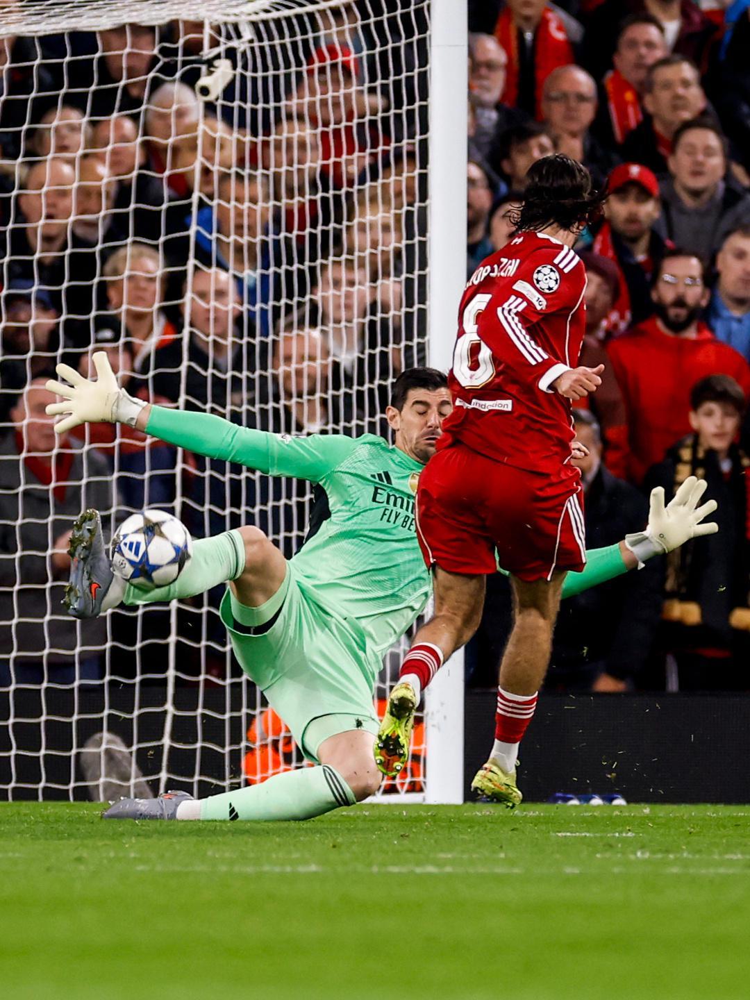 第32分钟,索博斯洛伊禁区外劲射击中楚阿梅尼手臂,利物浦索要点球未果,裁判认定球打手。半场结束前,索博斯洛伊远射再次被库尔图瓦单掌挡出,皇马0-0结束上半场。