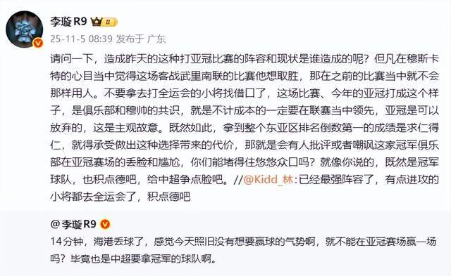 针对球迷"最强阵容已出"的辩护,李璇在社交媒体直言:"造成当前阵容的是谁?如果穆斯卡特真想赢武里南联,就不会在之前的联赛轮换9名主力。不要拿全运会当借口,这是俱乐部和主教练的共识——不计成本保联赛,亚冠可以放弃。既然选择战略放弃,就要承受东亚区排名倒数第一的代价。"