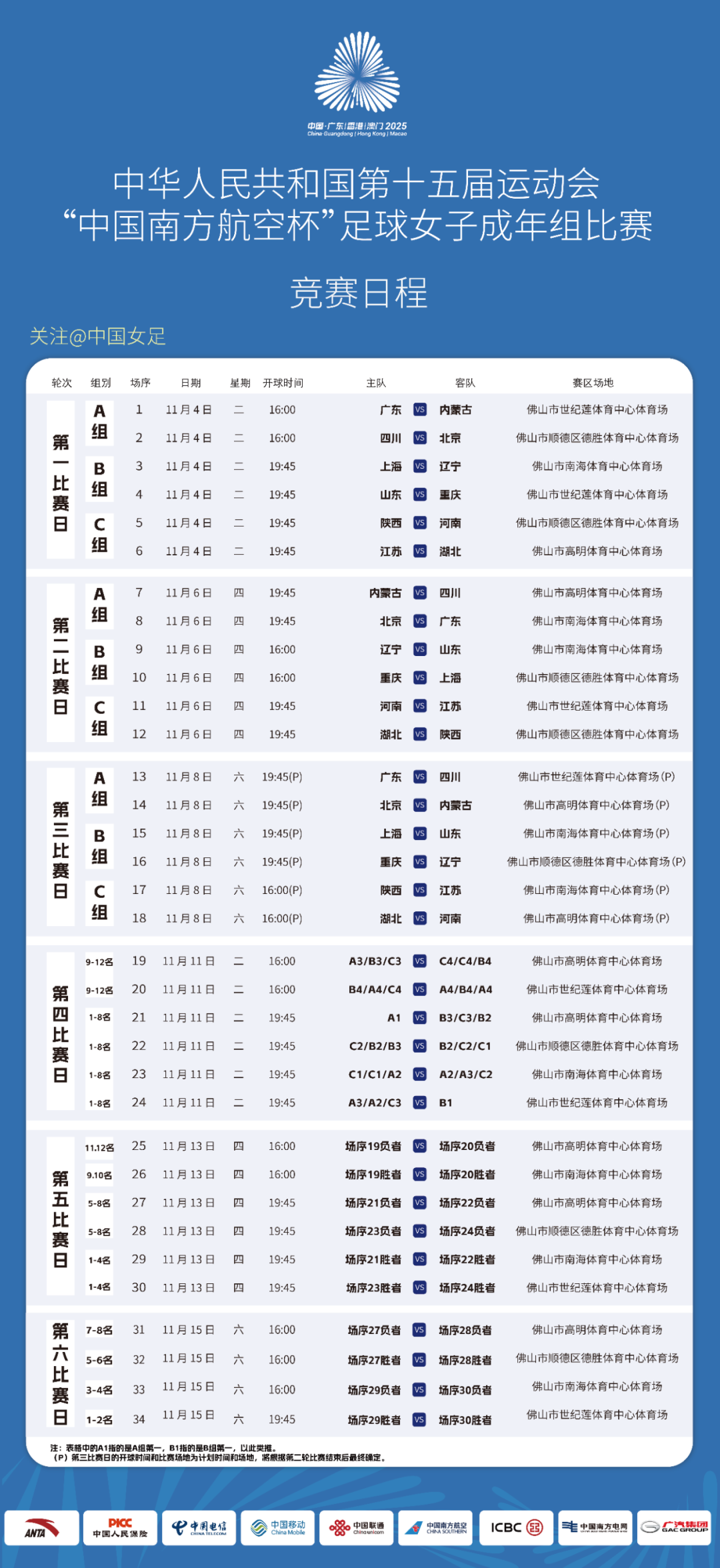 11月4日,细雨绵绵中,十五运会女足成年组比赛在佛山正式打响。广东队、山东队、四川队等12支劲旅分别在佛山世纪莲体育中心体育场、顺德德胜体育中心、南海体育中心体育场、高明体育中心四大场馆展开激烈角逐,为观众奉献了一场场精彩对决。