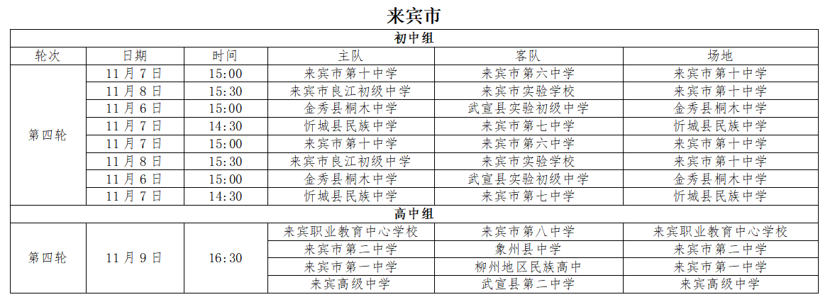 来宾赛区本周赛程密集,初中组第四轮比赛将于7日起在各主场展开,各队将为了积分榜的排名而全力以赴。高中组第四轮则于9日下午四点半统一开球,四场对决将决定各组积分榜的走势,各队将展开一场激烈的积分争夺战。