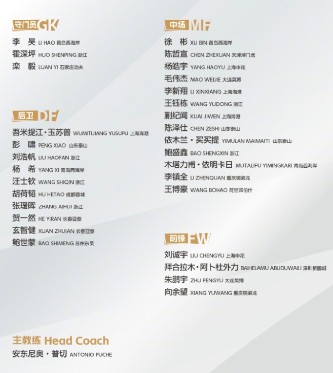 北京时间11月5日,中国足球队官方公布了U22国足熊猫杯的参赛名单,其中山东泰山队有三名球员入选,分别是陈泽仕、彭啸和依木兰。这三位球员将在全运会结束后,立即前往成都参加集训,为即将到来的熊猫杯国际足球锦标赛做准备。