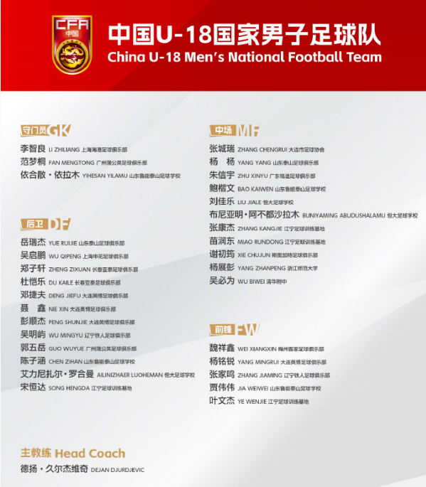 在其他国字号方面,U18国青将于11月6日至11月18日赴上海市组织集训,并与吉尔吉斯斯坦U-18国家男足进行两场封闭教学赛。山东泰山队的鲍楷文、贾伟伟、陈子涵、依合散·依拉木、杨杨、岳瑞杰六人入选,他们刚结束全运会的比赛任务。