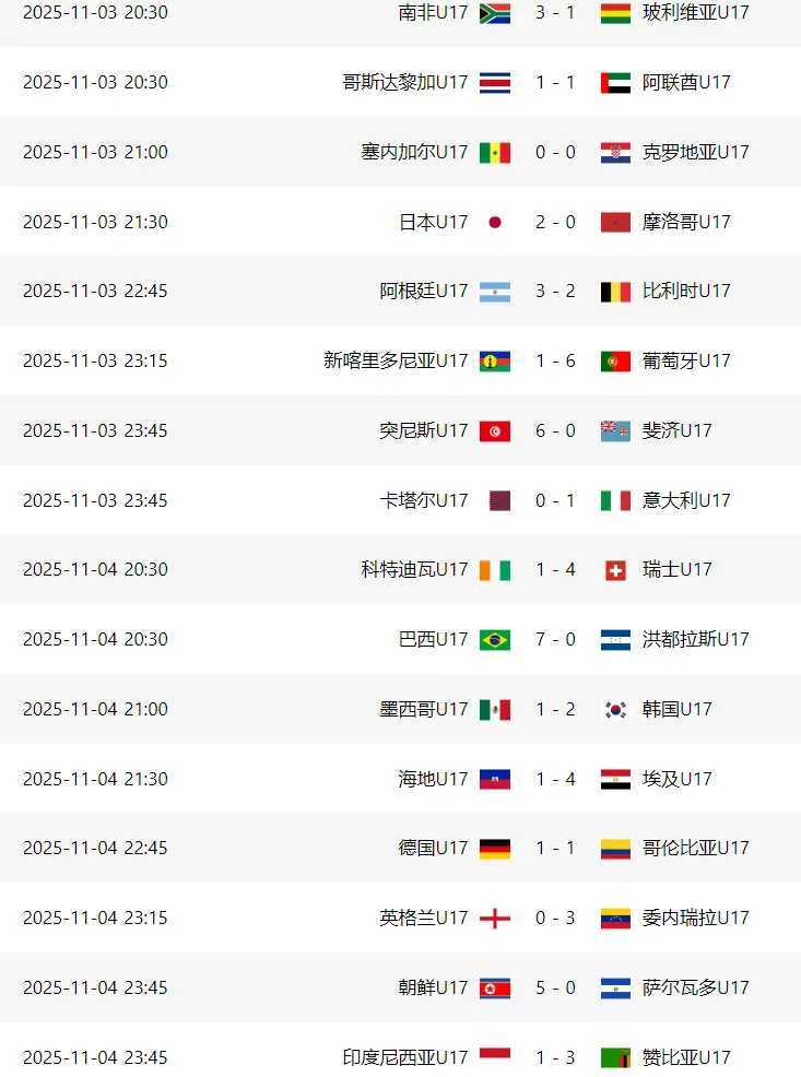首个比赛日,除了朝鲜队的5-0大胜外,还出现了多场大比分比赛。葡萄牙队以6-1狂胜新喀里多尼亚队,突尼斯队6-0大胜斐济队,巴西队更是以7-0血洗洪都拉斯队,均轻松斩获首胜。