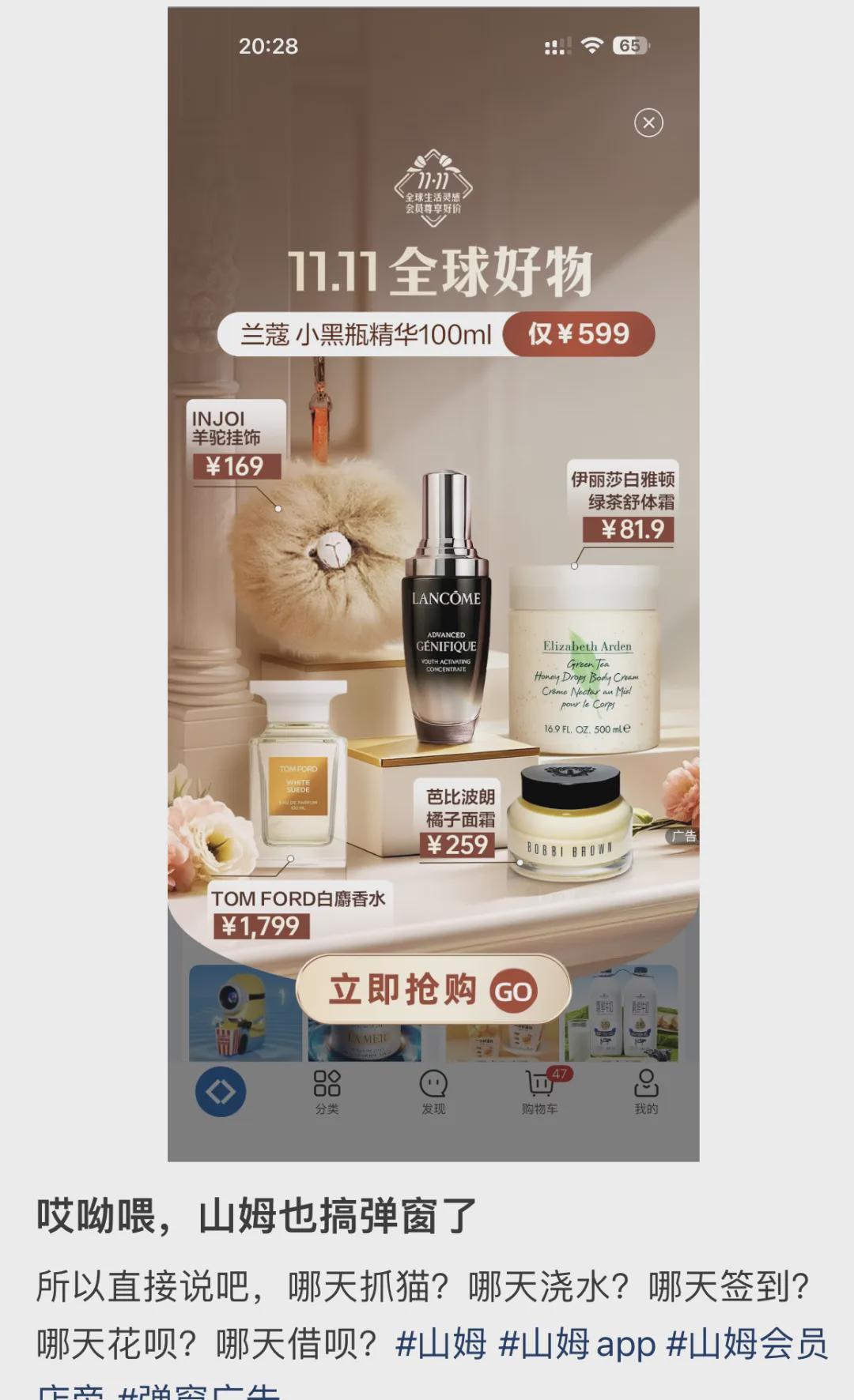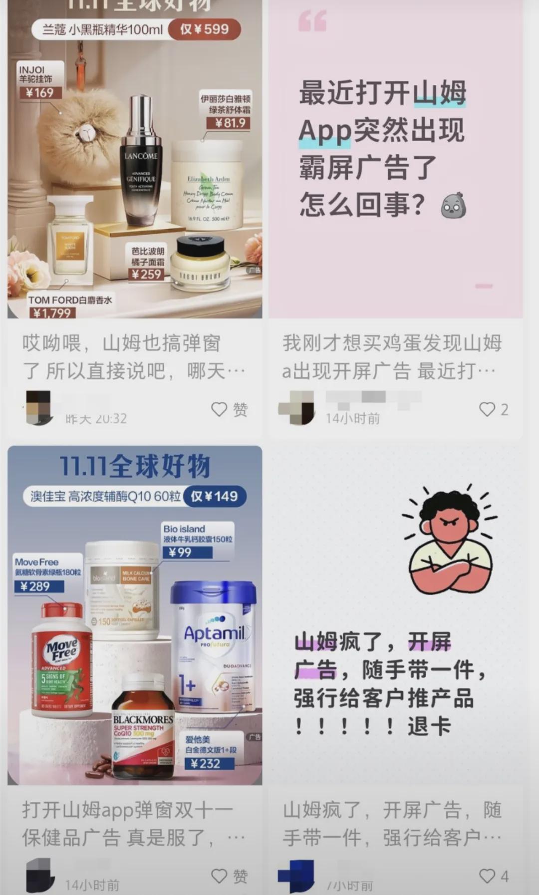 原来,这两天不少用户在社交媒体上吐槽,山姆APP也开始投放广告,给用户推荐品牌了,而且广告类型多样。比如,一开屏就有双十一弹窗广告,几乎覆盖全屏,让不少用户感到困扰。