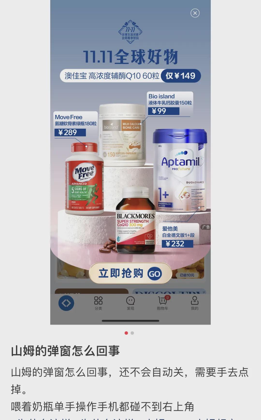 有网友吐槽:‘山姆的弹窗怎么回事,还不会自动关,需要手去点掉。喂着奶瓶单手操作手机都碰不到右上角。’这样的吐槽在小某书上一抓一大把,看来不少会员都被弹窗广告困扰了。