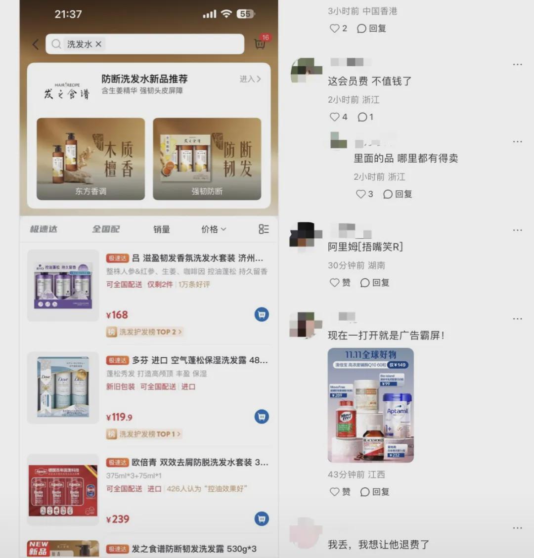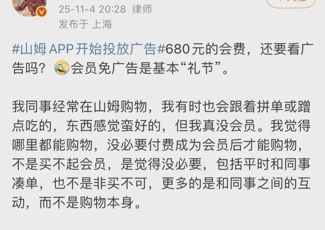 不少人认为,用户支付260元/年(卓越卡680元)会员费的核心诉求是无干扰购物体验,而广告植入则是双重复利,违背了会员制契约精神。有网友表示:‘山姆赚两份钱,吃相难看。’‘会员交卡费是为了看广告的吗?’
