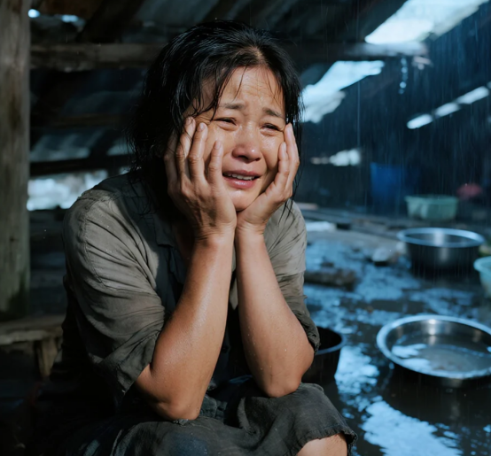 她看着丈夫踩着凳子,一次次用毛巾去堵漏水的缝隙,雨水顺着他的头发流下来,分不清是雨水还是汗水。