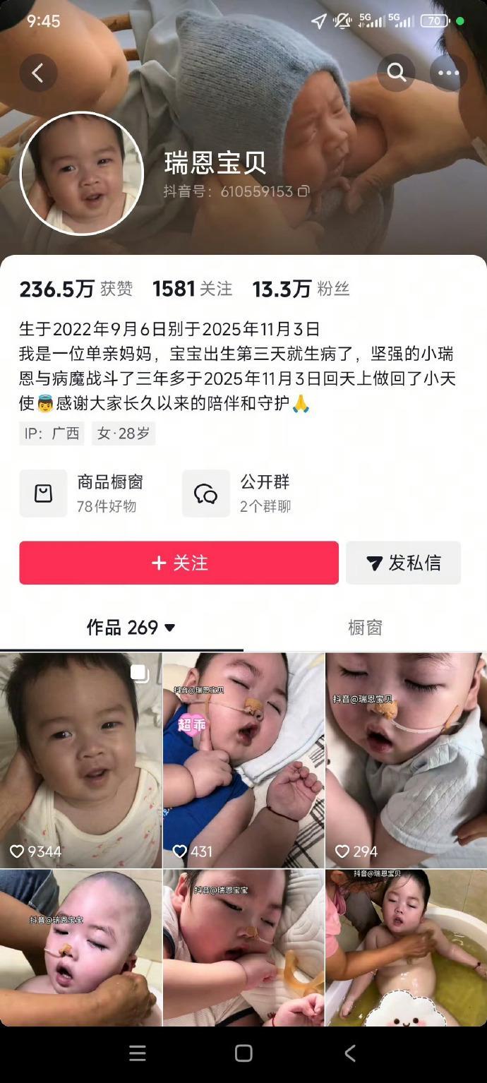 瑞恩的母亲是一位1997年出生的单亲妈妈。在瑞恩患病后,孩子的父亲选择了“中途消失”,留下母亲独自承担起照护孩子的重任。为了记录孩子的抗病日常,也为了寻求更多的帮助和支持,瑞恩的母亲通过个人社交账号分享了孩子的点点滴滴。这些视频不仅记录了瑞恩与病魔抗争的艰辛历程,也展现了母子之间深厚的情感。截至目前,这些视频已经获得了236.5万的点赞,积累了13.3万的粉丝。