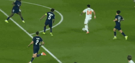 第44分钟,格纳布里脚后跟妙传,基米希插上的射门差之毫厘,巴黎门前风声鹤唳。