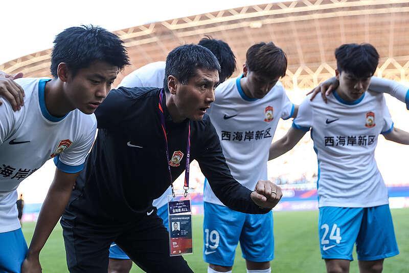 2025年6月22日,大连,2025足协杯1/8决赛,大连鲲城对阵青岛西海岸。图为邵佳一为队员鼓劲。视觉中国供图