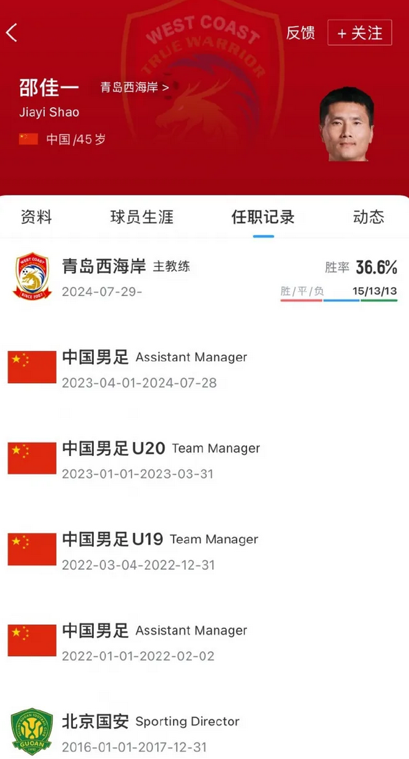 在本赛季的中超联赛中,邵佳一执教的青岛西海岸队表现出色。29轮比赛过后,球队取得了9胜10平10负的成绩,积37分,最终排名第9。这样的成绩也证明了邵佳一具备一定的执教能力。