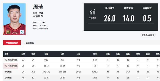 周琦在有限的时间里疯狂输出,两场比赛共砍下52分并抢下28个篮板,这样的效率令人叹为观止。