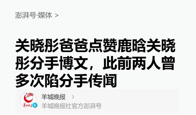 澎湃号:关晓彤爸爸点赞鹿晗关晓彤分手博文,此前两人曾多次陷分手传闻