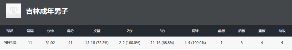 吉林全运男篮首胜的头号功臣姜伟泽,本场比赛迎来大爆发。他首发出战31分02秒,贡献了18中13的超高投篮命中率,其中三分球16中11,命中率接近七成,外加罚球4中4,一人狂轰41分4篮板4助攻,表现无可阻挡。