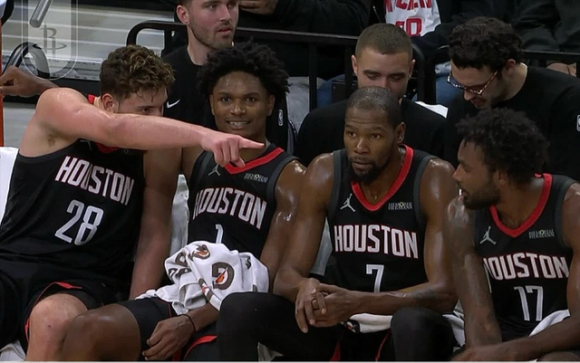 灰熊队的防守策略让人费解,他们似乎完全不顾火箭队的其他球员,即便放对手大空位也要夹死杜兰特。这种极致的防守让杜兰特在板凳上时还在思考,为什么灰熊要如此针对他。而此时,申京、阿门和伊森三人聊得兴起,哈哈大笑,只有杜兰特闷闷不乐地夹在中间,形成了鲜明的对比。