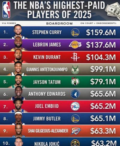 2025年收入榜前十名单完整呈现NBA商业格局:库里(1.596亿)、詹姆斯(1.376亿)、杜兰特(1.043亿)、字母哥(9910万)、塔图姆(7910万)、爱德华兹(6560万)、恩比德(6520万)、巴特勒(6510万)、亚历山大(6330万)、约基奇(6320万)。这份榜单不仅反映球员的竞技价值,更折射出新时代运动员商业转型的趋势。