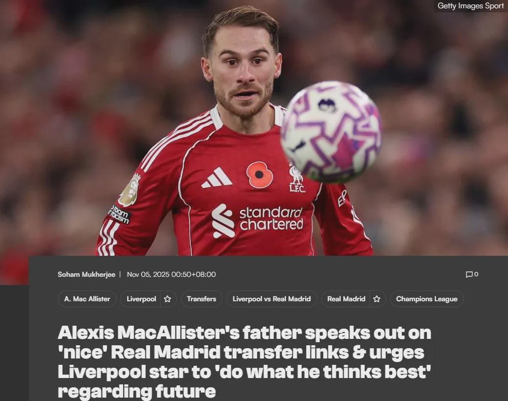 麦卡利斯特父亲回应皇马转会传闻:尊重利物浦,未来由儿子决定
