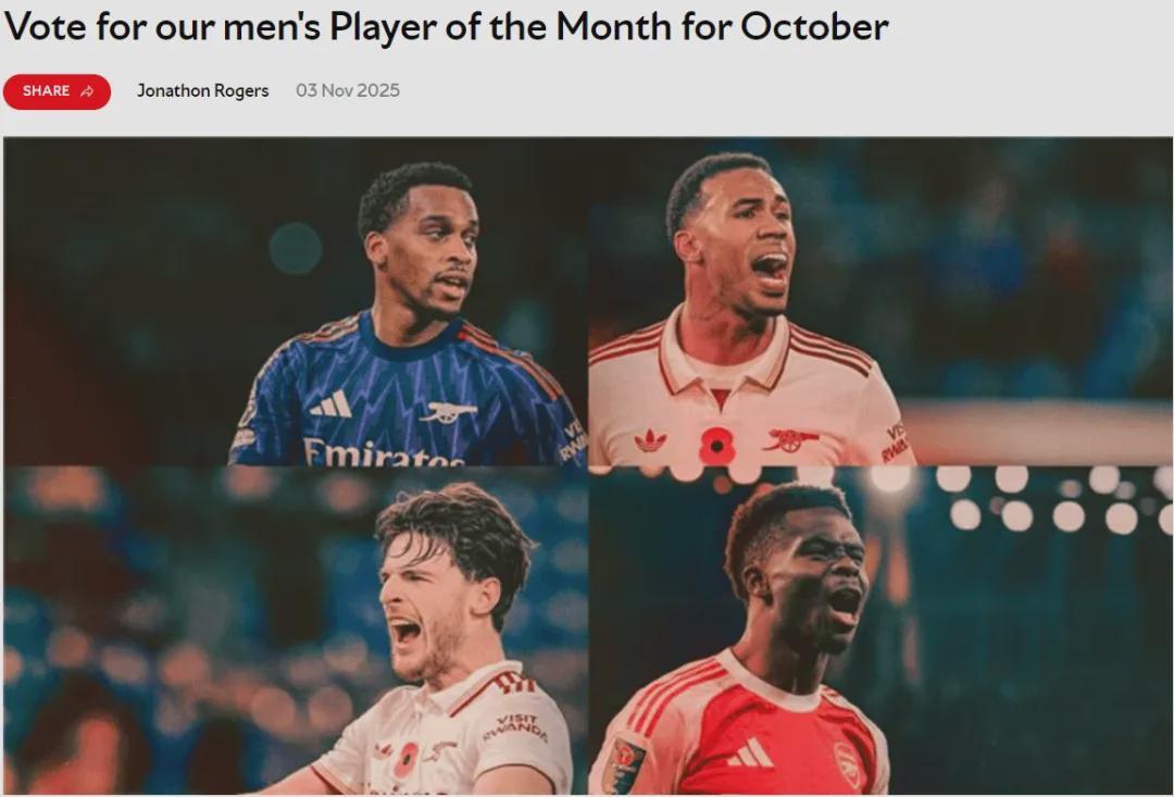 官方宣布,阿森纳的廷贝尔、加布里埃尔、赖斯和萨卡被提名为了队内10月份最佳球员候选。我个人认为首先排除萨卡,廷贝尔、加布和赖斯之中产生最佳的可能性大,我个人倾向于赖斯。最近的确是没啥转会新闻,小道消息咱就不说了,这个赛季的主题是享受胜利!