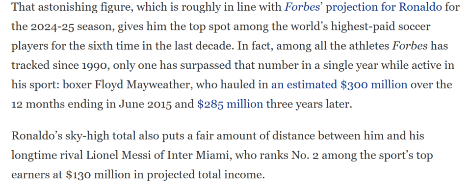 福布斯公布2025年度世界足坛收入前十 18岁亚马尔3.1亿元进入前十