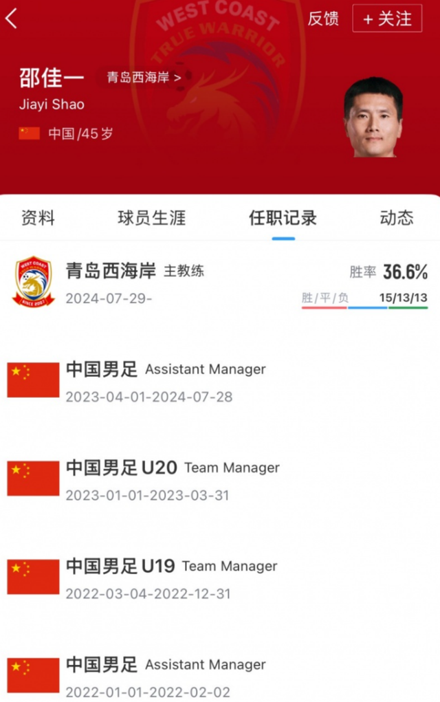 然而风险同样明显。邵佳一执教青岛西海岸两个赛季,最佳成绩仅为中超第9名。而国足过去23年已更换19任主帅,平均任期仅1.6年。