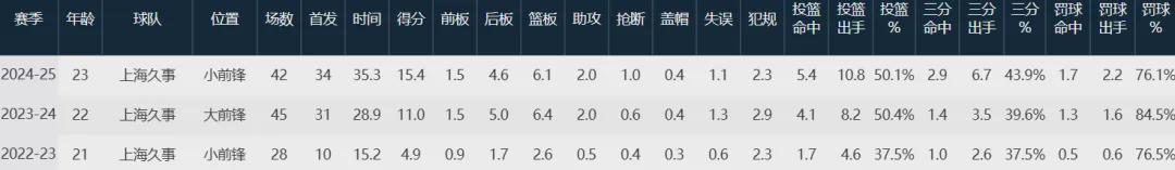 回顾24-25赛季,李弘权在CBA联赛中同样效力于上海队,表现可圈可点。常规赛中,他场均贡献15.4分、6.1个篮板、2次助攻和1次抢断,同时以43.9%的命中率投进2.9记三分球。季后赛中,他场均得到14分、8个篮板、2.3次助攻和1次盖帽,尽管三分命中率略有下降至27.3%,但仍能投进2记三分球。凭借出色的表现,李弘权在该赛季生涯首次入选全明星阵容,并荣膺本土第二阵容。