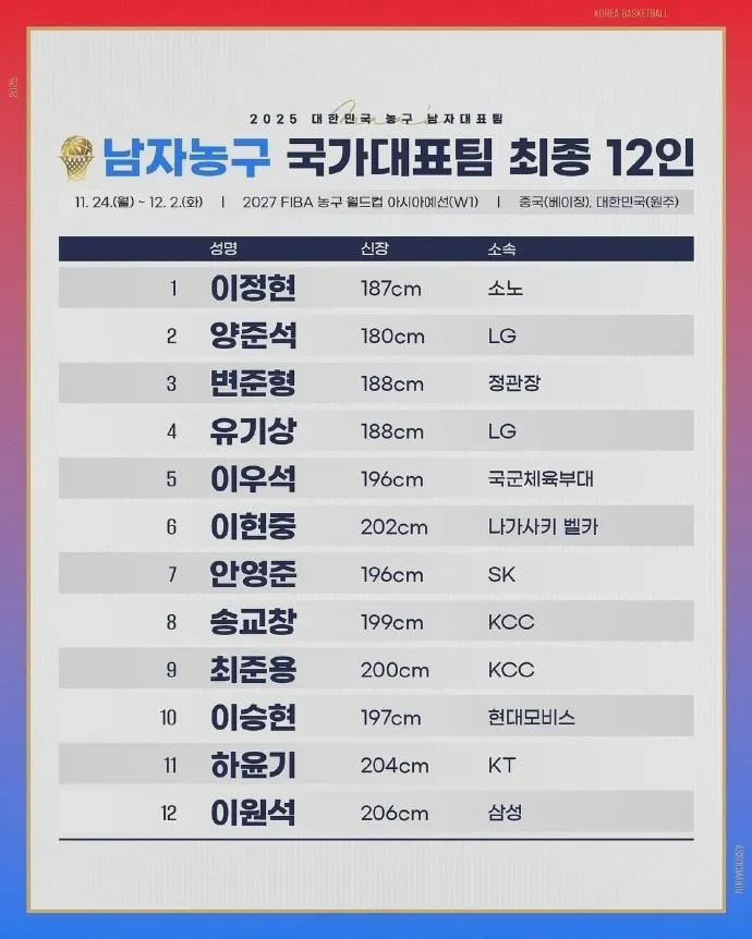 值得一提的是,韩国男篮已经公布了出战世预赛的12人大名单,由李贤重领衔。在今年亚洲杯八强赛中,中国男篮曾以79-71击败韩国男篮。那场比赛中,韩国队的当家球星李贤重投篮15中6,其中三分11中2,罚球9中8,贡献了22分、7个篮板和4次助攻。