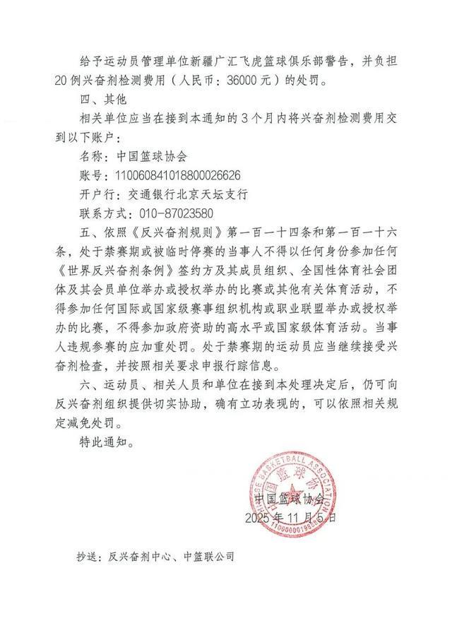 鉴于哈雷尔的违规行为,中国篮球协会依据相关条例,对其作出了严厉的处罚决定:给予该运动员禁赛3个月的处罚,禁赛期从2025年11月5日至2026年2月4日。同时,为了强化俱乐部的管理责任,给予新疆男篮俱乐部医疗与反兴奋剂负责人吴杰警告处罚,并对新疆男篮俱乐部本身也给予了警告,同时责令其承担20例兴奋剂检测的费用,共计36000元。此外,通知中还明确了禁赛期间的相关限制以及费用缴纳等其他事项。