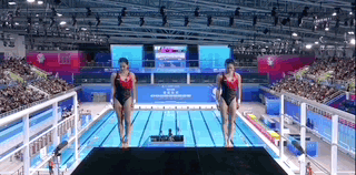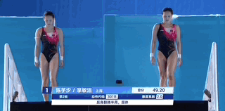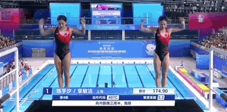 进入第三跳,陈芋汐和掌敏洁在107b动作上依旧保持着惊人的同步率,动作完成质量极高,以174.9分继续领跑,领先第二名近10分,优势进一步扩大。