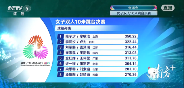 11月6日晚,第十五届全国运动会跳水女子双人10米台决赛在广东省奥体中心游泳跳水馆精彩上演。经过多轮激烈角逐,上海组合陈芋汐/掌敏洁凭借默契配合与出色发挥,成功摘得金牌,四川组合李蕊汐/卢为获得银牌,江苏组合刘军熙/孟泽瑞获得铜牌,而广东组合全红婵/王伟莹则位列第五。