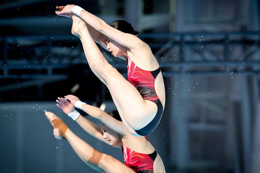第三轮自选动作,全红婵的水花效果还是不理想,这一跳全红婵/王伟莹得到72.00分,而陈芋汐/掌敏洁非常稳定,这一跳得到80.10分。前三轮后名次不变,陈芋汐/掌敏洁第一,全红婵/王伟莹第三。