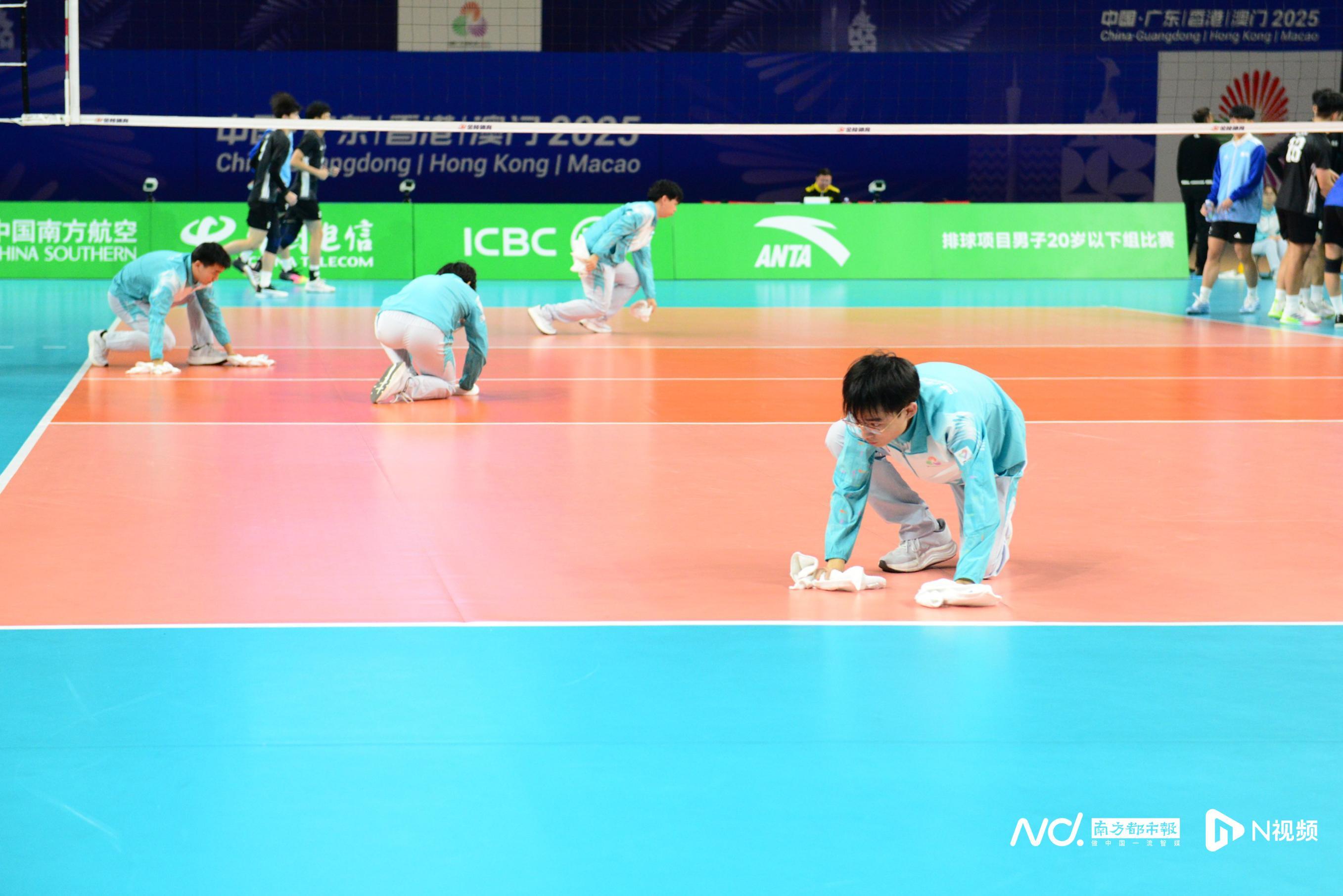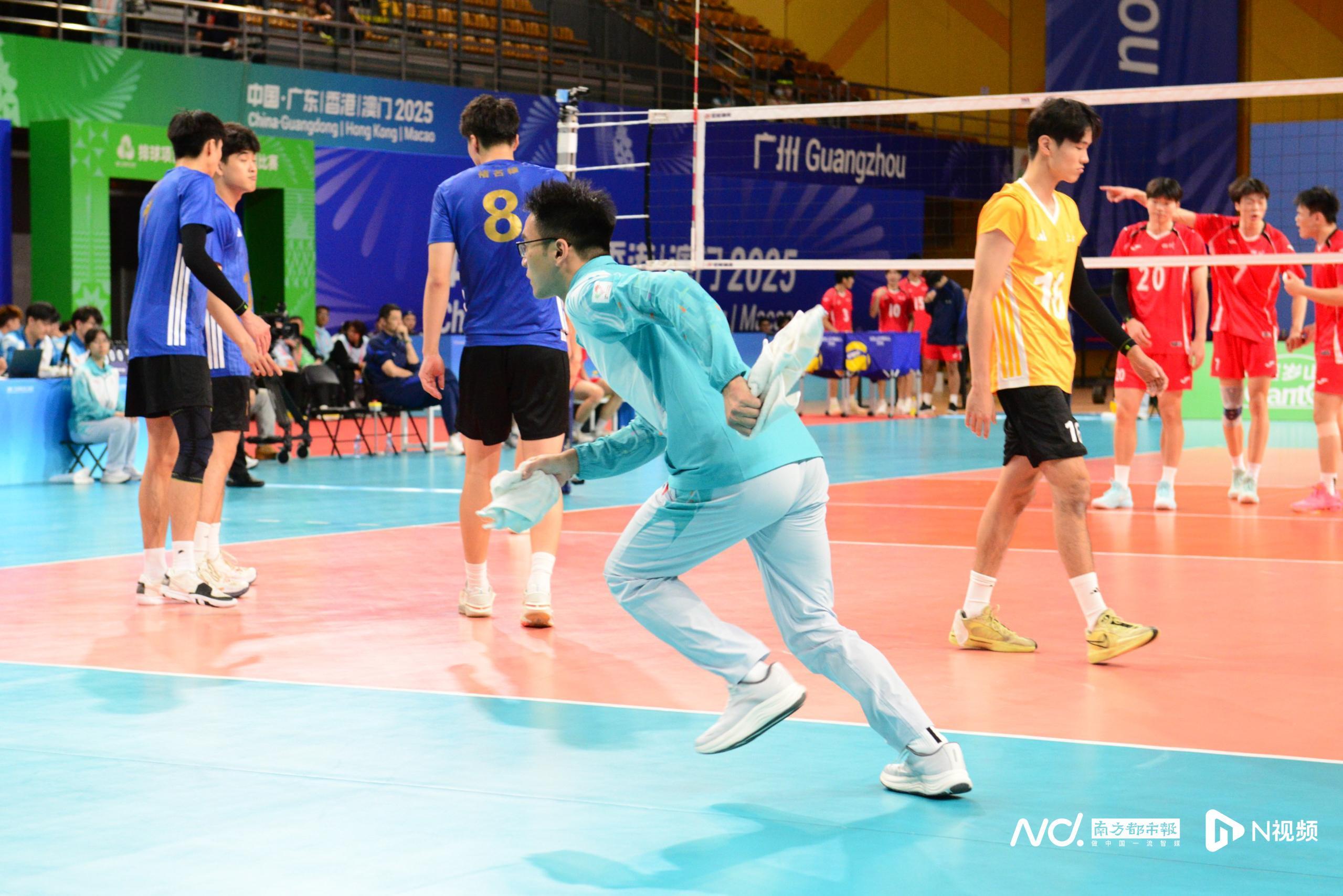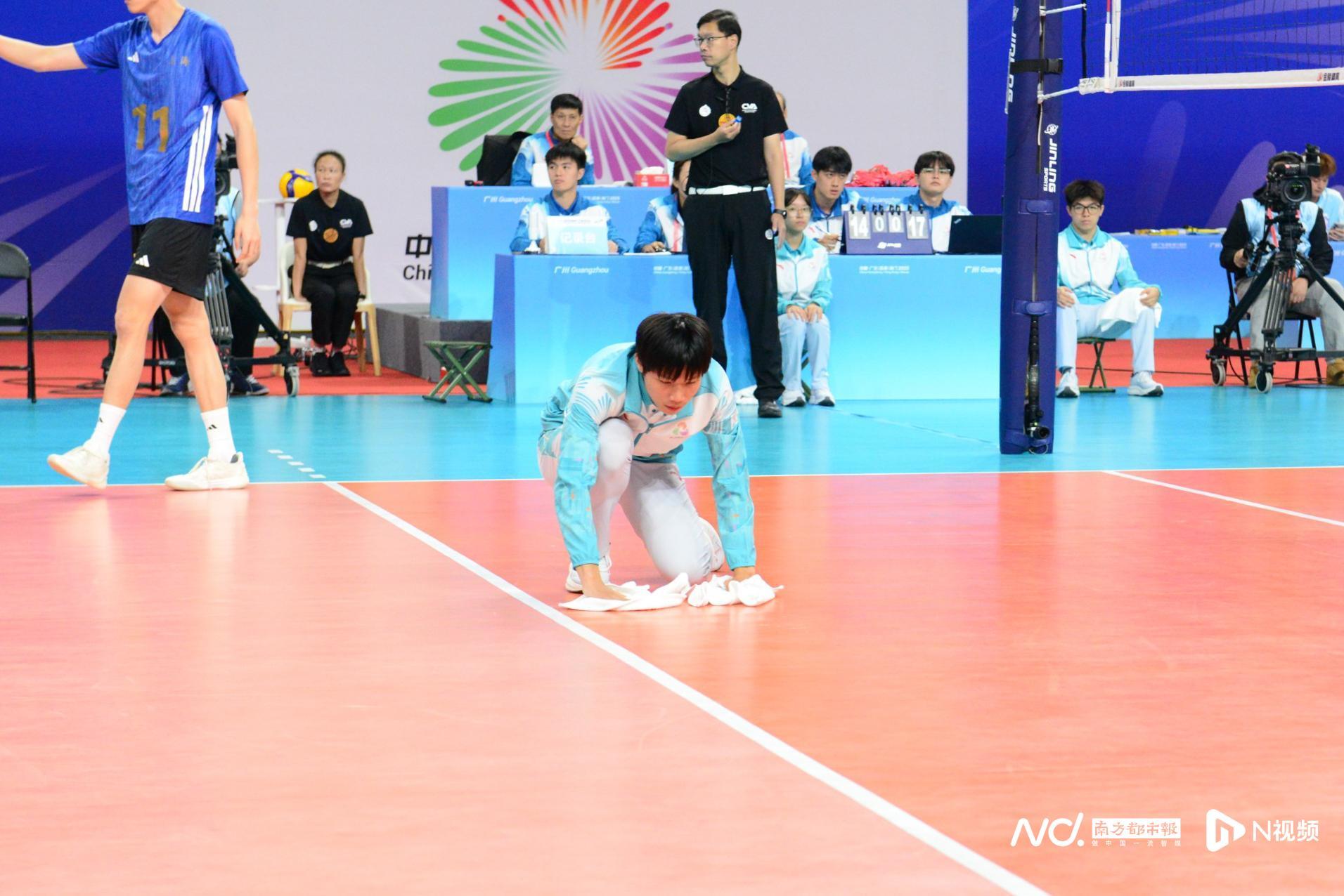 南都讯 起跳、拦网、扣杀!日前,十五运会排球项目男子20岁以下组(以下简称“U20男排”)正在华南农业大学体育馆火热进行。每当比赛哨声响起,数道蓝色身影便迅速举手示意,手持抹布冲入场内,以闪电般的速度擦干地面汗渍——他们就是被称为“快擦手”的志愿者。