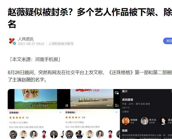 2021年8月,赵薇突然被全网封杀。其代表作《还珠格格》《情深深雨濛濛》等从视频平台下架,演员表名字被删;微博、抖音账号被封禁;商业代言纷纷解约,品牌方连夜撤下海报。企查查数据显示,她参股的多家公司股权被冻结,合宝文娱集团有限公司多次被强制执行,截至2025年7月,500万股权仍被冻结至2028年。